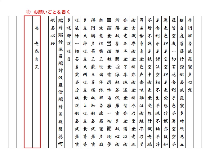 ②次に、般若心経の最後から1行空けてお願いごとを書いていきます。